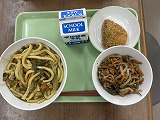 本日の給食は「豚肉と野菜のソース焼きそば」「ししゃもの磯辺焼き」