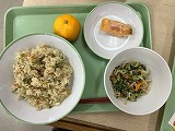 本日の給食は「かやくご飯」「とりの唐揚げ」「小松菜のごま和え」