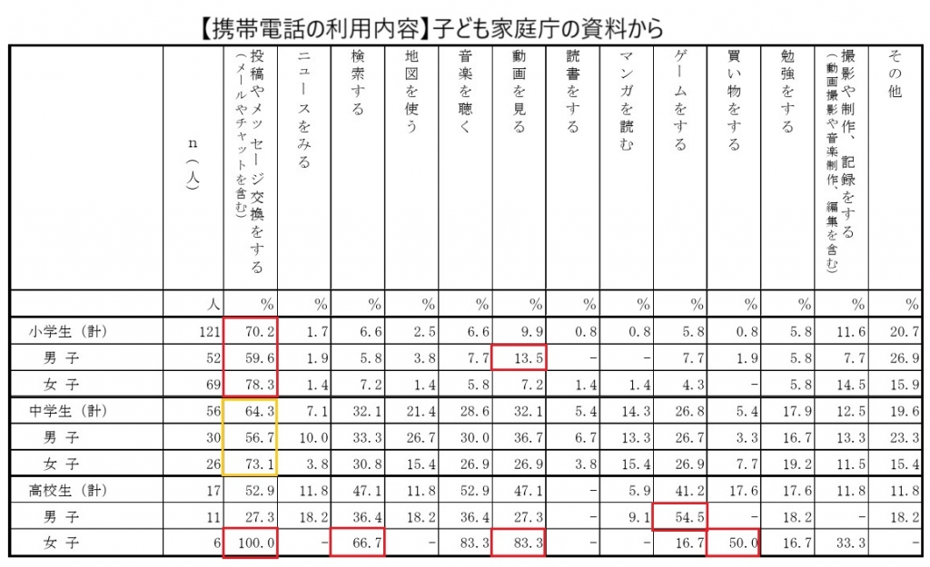今日は、授業参観と合わせ、豊見城警察署生活安全課少年係の方を講師としてお招きして、『SNSトラブル防止教室』を開きました。SNS上に載っている情報を信じ込まない、大切な情報をアップしない、マナーを守って使う、課金をしない、有害情報をシャットアウトするなどについて学習しました。今日学習したことについて、各家庭でもスマホやゲームについて、お子さんと話し合われてください。以下の表は、子ども家庭庁の資料の一部です。お子さんたちの実態を知る資料としてご覧下さい。