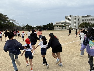 異学年でペアを組み、ハンターに捕まらないように運動場を逃げ回りました。