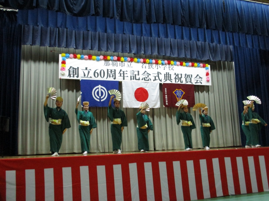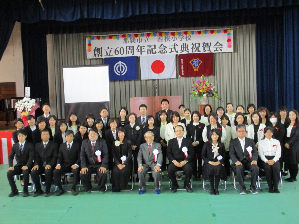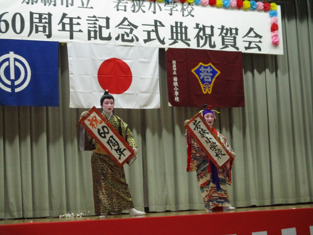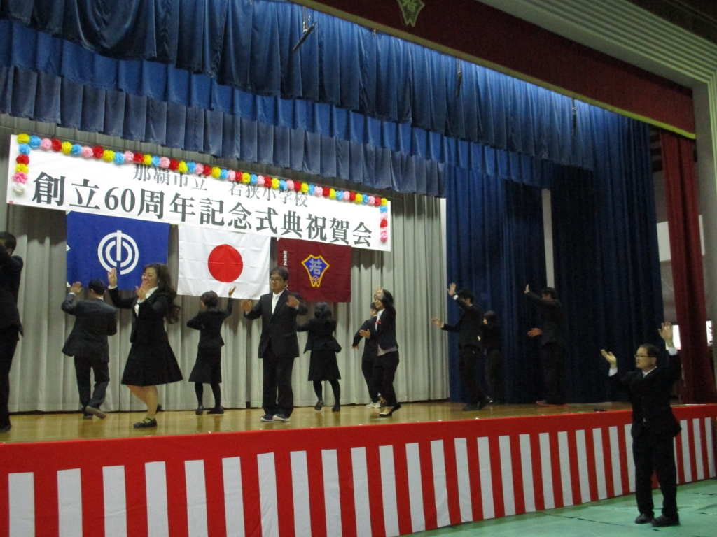 1月21日(土)、若狭小学校創立六十周年記念式典・祝賀会が行われました。知念覚副市長、那覇教育事務所 田端一正所長、那覇市教育委員会 渡慶次克彦教育長にご祝辞をいただき、また、多くの来賓の皆様にお祝いの言葉を頂戴しました。祝賀会では、かぎやで風を幕開けに、玉城流翔節会家元 玉城節子先生の創作舞踊やスーパーブライダルバンド様の生演奏、若狭・松山旗頭実行委員会様、波上宮獅子舞保存会様の演舞、地域・保護者によるエイサーなど祝賀会を大いに盛り上げてくださり盛会に終えることができました。ご支援、ご協力頂きました全ての皆様に心より感謝いたします。ありがとうございました。