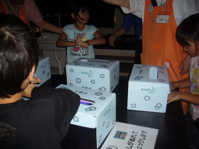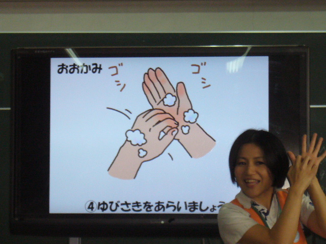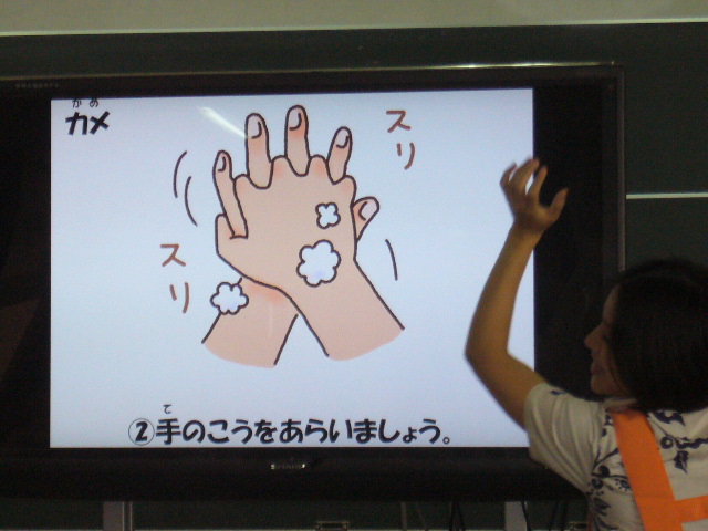 子どもたちに手洗いの大切さに気づいてもらい、洗い方を習得してもらうプログラムです。 正しい手の洗い方を『あわあわ手あらいのうた』を使って練習し、普段目に見えない「手の汚れ」を可視化することで自分の手洗いのくせや洗い残しを確認する体験の時間も設け、正しい手洗いへの動機づけを行うプログラムです。洗い残しにみんなビックリ、みんな真剣にゴシゴシ、キュッキュッと真剣に洗っていました。