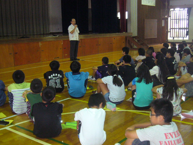本日は1学期開始朝会が行われ、1学期前半の振り返りや夏休み期間中の水泳教室、校内で羽化したオオゴマダラの紹介、後半の激励などの校長先生のお話を、各教室で聞きました。