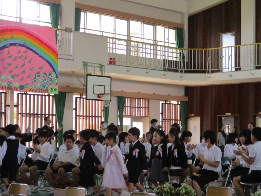 校長先生からは、「今日からピカピカの一年生、皆さんが入学してくるのを先生方も在校生も待っていましたよ。校長先生からは、3つの約束をして欲しいと思います。一つ目は、元気よく登校する、②先生のお話はしっかり聞く③お友だちをたくさんつくる しっかり学ぶ1年生になって下さい。」とのお話がありました。