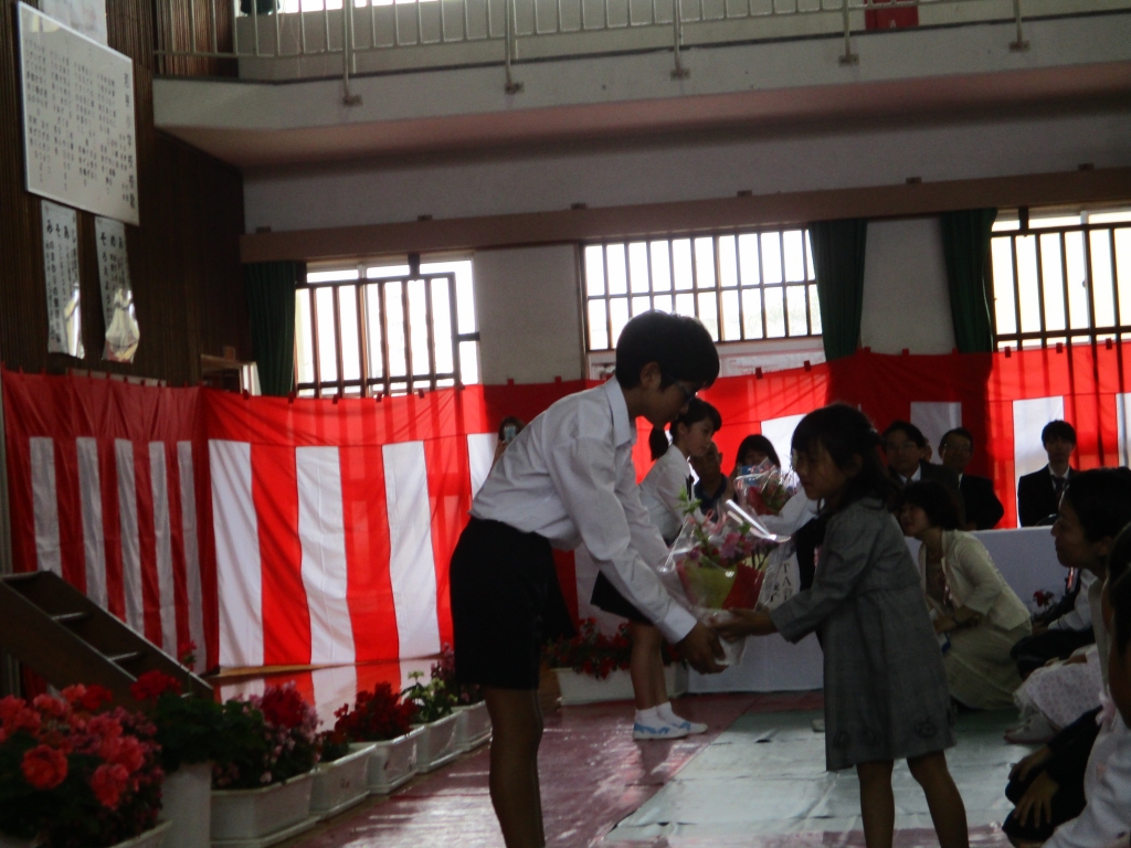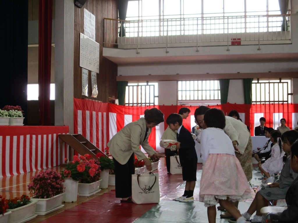 6年生からお花のプレゼント 民生委員の皆さんからは学用品のプレゼント 福原綾子PTA会長のあいさつ