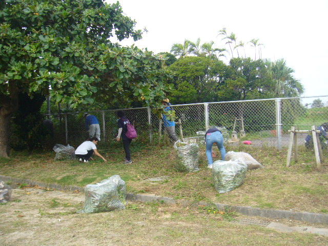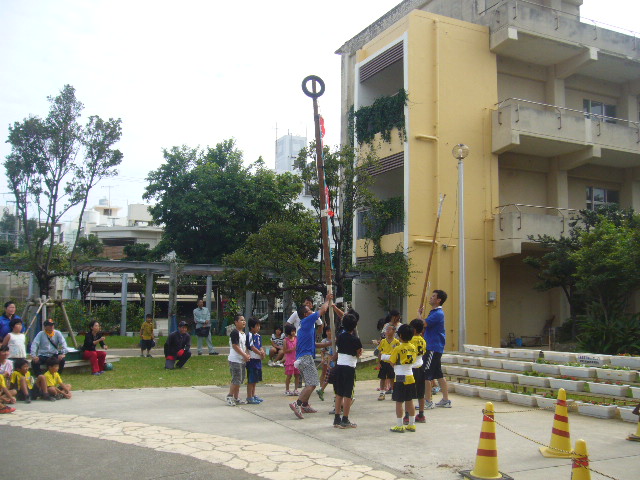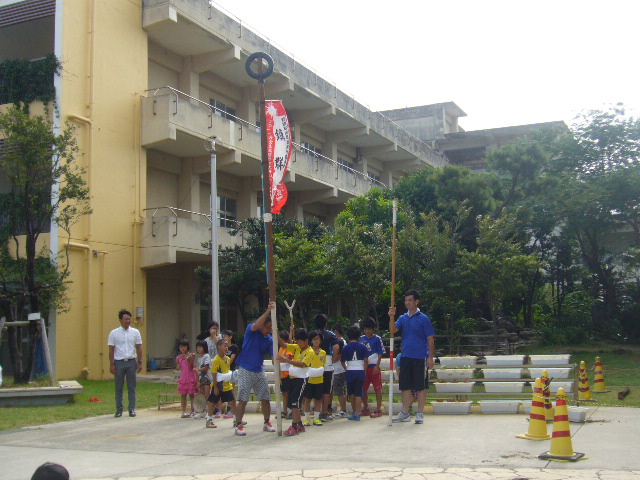 明日、30日は旗頭フェスタが奥武山陸上競技場で行われます。作業終了後、旗頭の演舞が行われました。