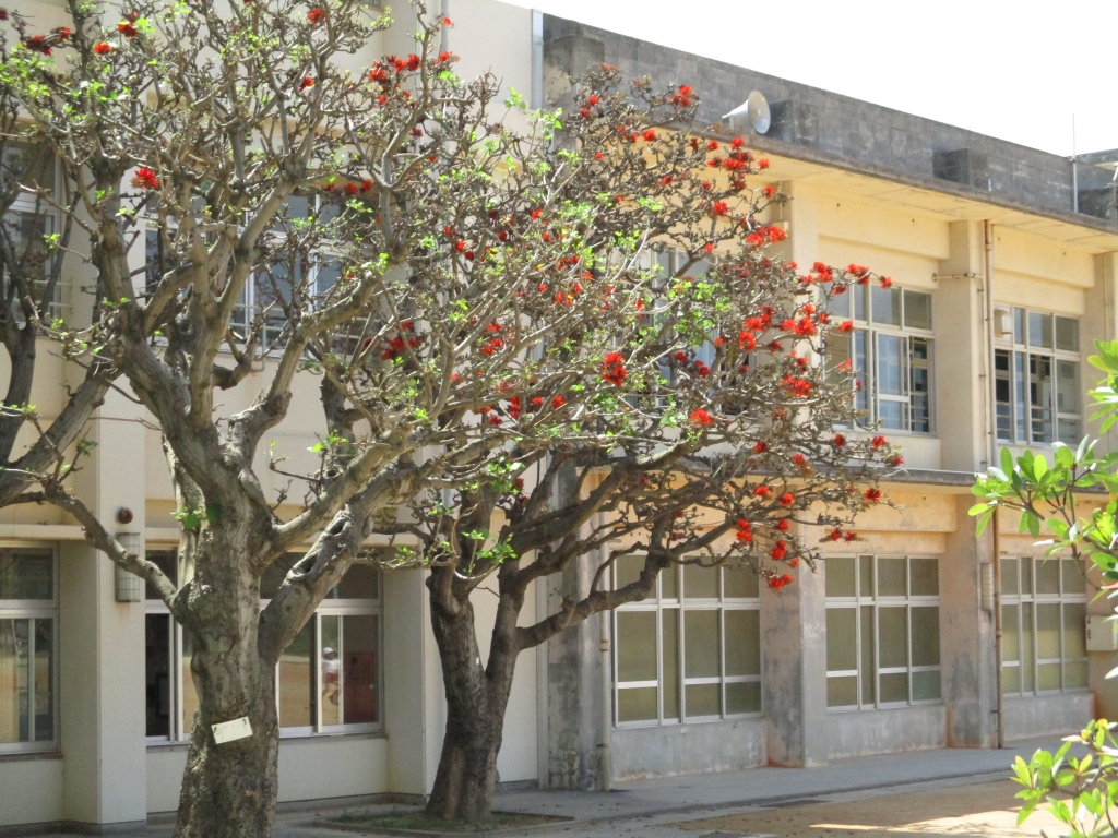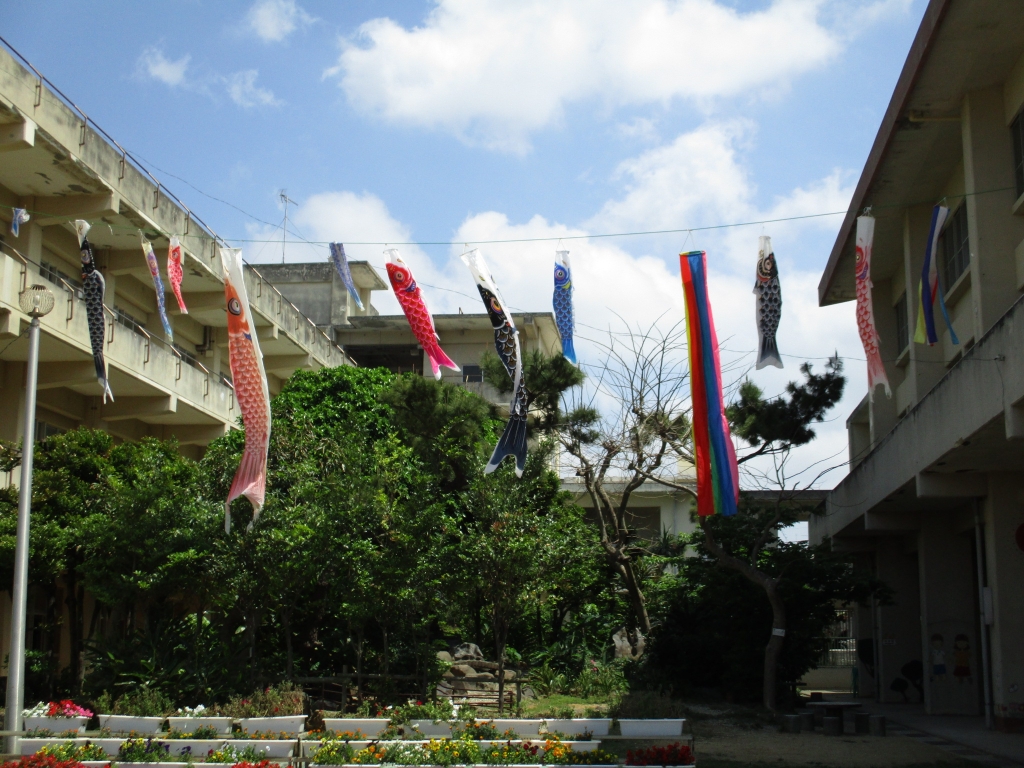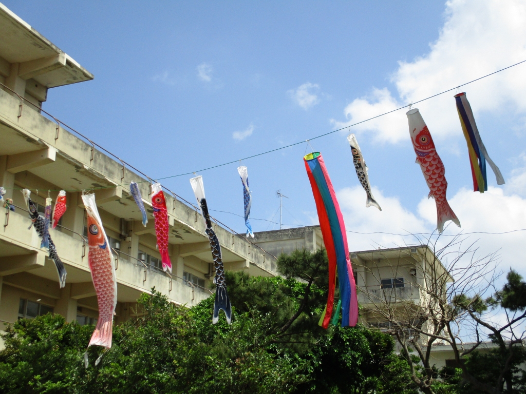 校庭のデイゴの花が今年もきれいに咲きました。校舎内 から見える鮮やかなオレンジ色の花はホッと心が和みます。中庭には、こいのぼりも上がりました。元気な若狭っ子に負けないように空を元気よくおよいでいます。