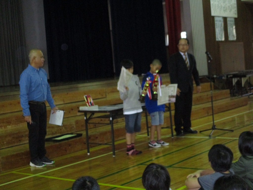 12月7日(木)、表彰朝会が行われました。タイムス展では、優良賞の1年のこうじさん、いとはさん、2年のゆうかさん、みことさん、4年のあとむさん、こうたろうさんが表彰されました。他に、紙飛行機大会学年の部優勝のあおさん、那覇・浦添地区音楽発表会出場の六年生全員、独唱で出場した4年のまなぶさん、空手やバレーのみなさんが表彰されました。