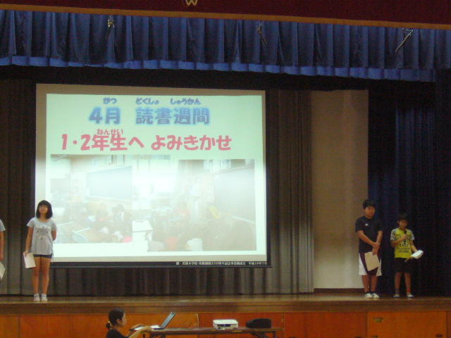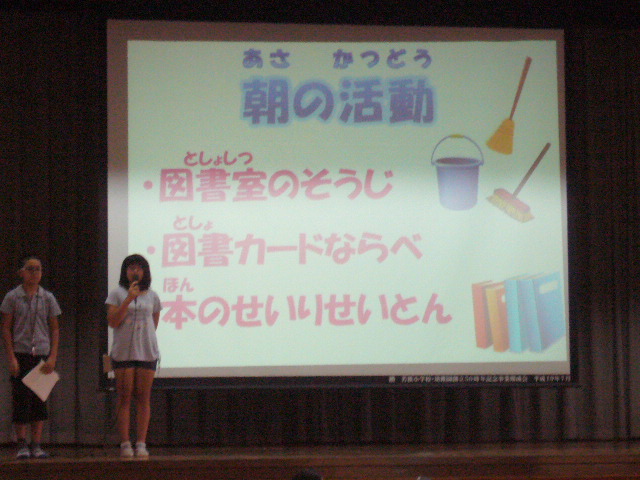9月8日(木)、図書朝会がありました。図書委員さんが、「9月1日から読書月間に入りました。きまりを守って図書館を利用し、先生や友だちと本について話し合ってください。」と発表してくれました。若狭っ子のみなさん、よい本をたくさん読んでくださいね。