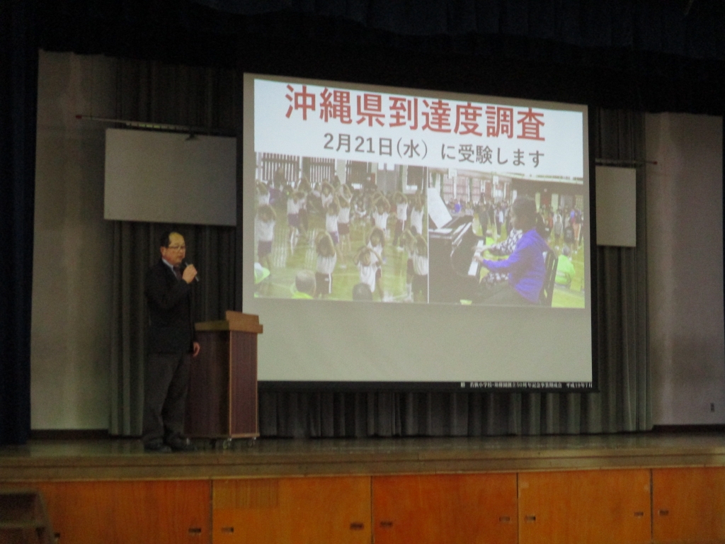 2月8日(木)、お話朝会が行われました。今月、21日に実施される県到達度調査についてお話がありました。「県到達度調査は、3年生以上、6年生まで、3年生は国語、算数の2教科、4年6年生は算数、5年生は、国語、算数、理科の3教科実施されます。力を発揮して、最後まで頑張って取り組んでください。」「みそあじ、そめあじを守りましょう。家庭学習をしっかりやりましょう。」とのお話がありました。