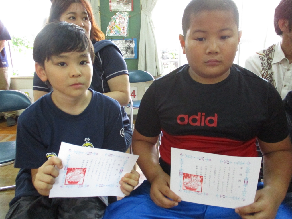 4月13日(金)、なかよし学級・チャレンジ学級合同学級開級式が行われました。どのお友だちも、元気な返事ができました。新しい先生の紹介や校長先生のお話では、「なかよし・チャレンジ学級のみなさん、進級おめでとうございます。名前を呼ばれたらしっかり返事ができました。お話も聞くことができましたね。今日はみなさんに手作りスタンプ入りの賞状をプレゼントします。」と一人一人に手作りスタンプ入りの賞状をくださいました。