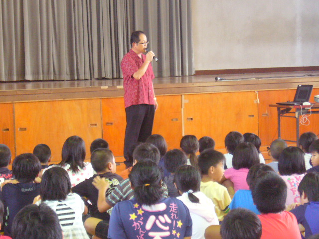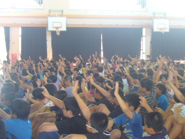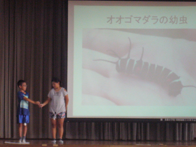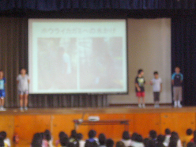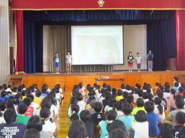 7月14日(木)児童朝会がありました。担当はビオガーデン委員会です。オオゴマダラの飼育の様子や池の様子、毎日の仕事の様子を知らせてくれました。毎日一生懸命世話してくれます。ありがとうございます。