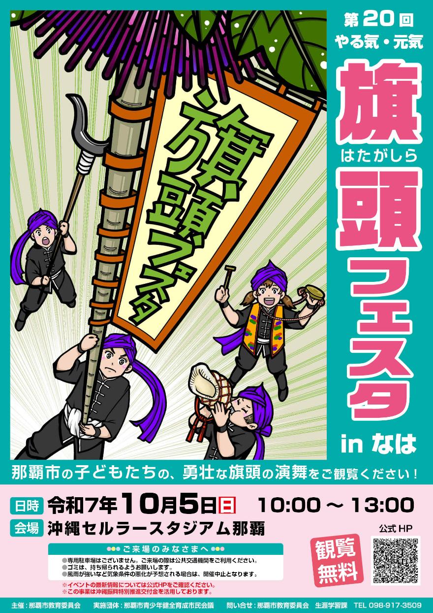 10月6日(日)に沖縄セルラースタジアムで、「第19回やる気・元気旗頭フェスタ」が開催されます。本校でも8月から10名の生徒が青少協の皆さんの指導のもと練習に励んできました。お忙しい中、ご指導いただきありがとうございます。旗頭の字は『道知徳体(ち・とく・たいのみち)』です。出演時間は【10:52 真和志ブロック8校】【12:02 旗頭演舞(中学生)】の2回になっています(時間はおおよその予定)。伝統文化である旗頭、勇壮にあげられることを期待しています。ぜひ、多くの皆さんにも披露できるといいですね。